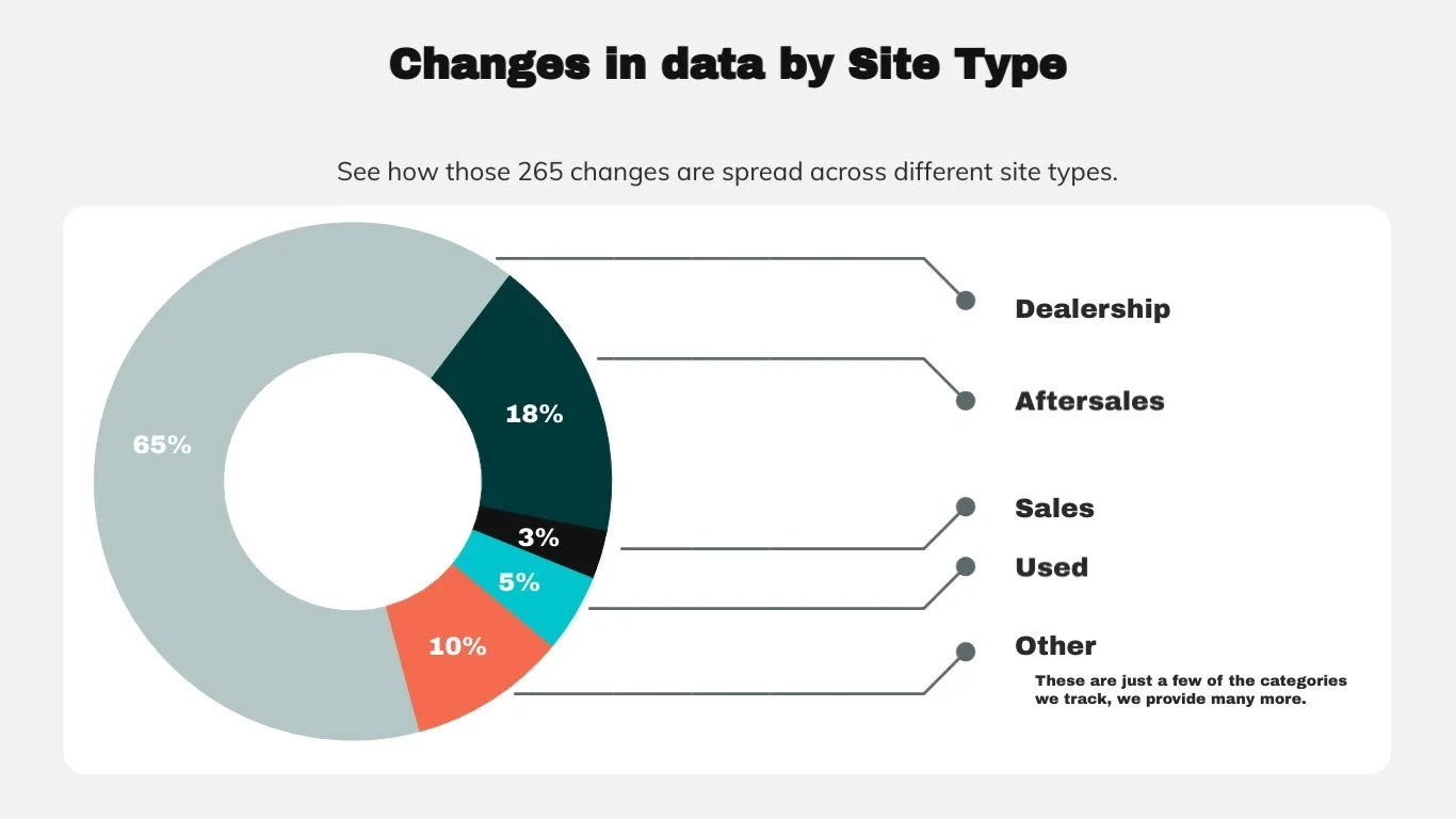 Spreading the changes in data by their site type, the numbers are weighted towards dealerships, the remainder aftersales sites, plus a mixture of used cars and others.