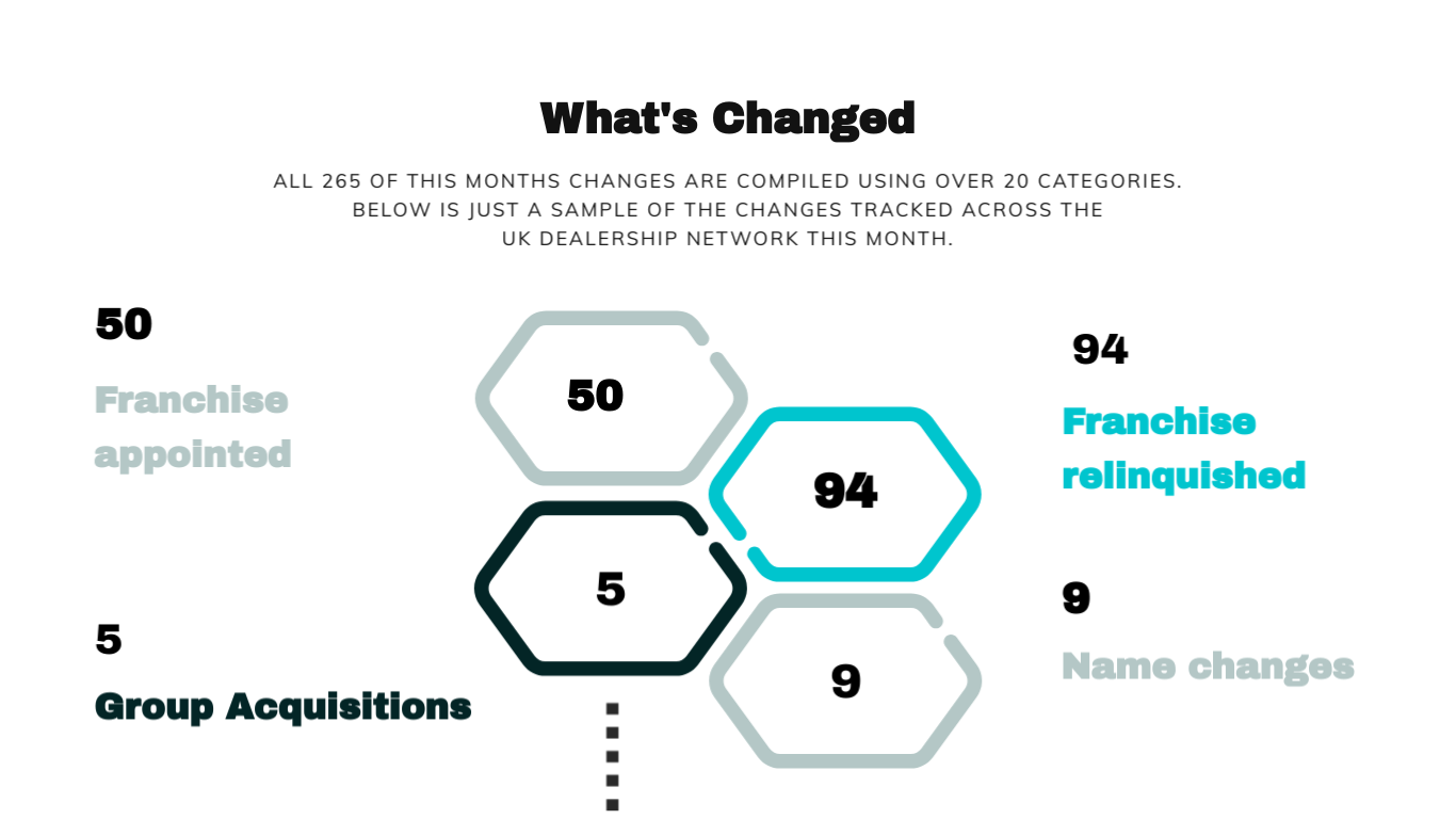The UK Dealership Analysis Report for April 2023 presents data across a number of dealership categories. For April, we’ve recorded 265 changes in total.