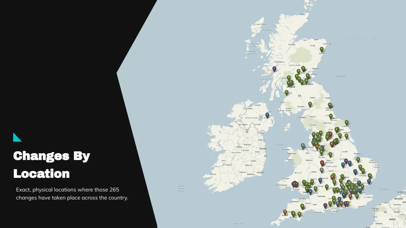 Aprils changes in location illustrate a reasonable spread accross the country. As usual there are clusters around the capital.